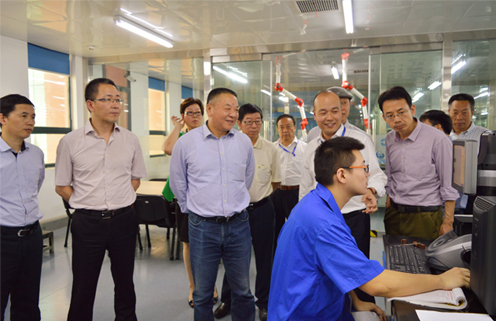 近日,寧波市政協副主席陳炳水(左三)一行來公司參觀考察。開發區管委會副書記鄭俊(左二)、溫州經開區科技局局長葉曉琴、公司副總裁邊毅力、研究院院長祁更新、參事室主任鄭春乾陪同參觀了公司展廳、研究院、檢測中心和部分生產車間。