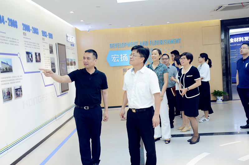 卓高柱會長一行參觀了“世界宏豐”展示廳。該展示廳通過企業宣傳片、科研成果、產品展示三大篇章,展現了電接觸材料的發展以及溫州宏豐的過去、當下和未來。
