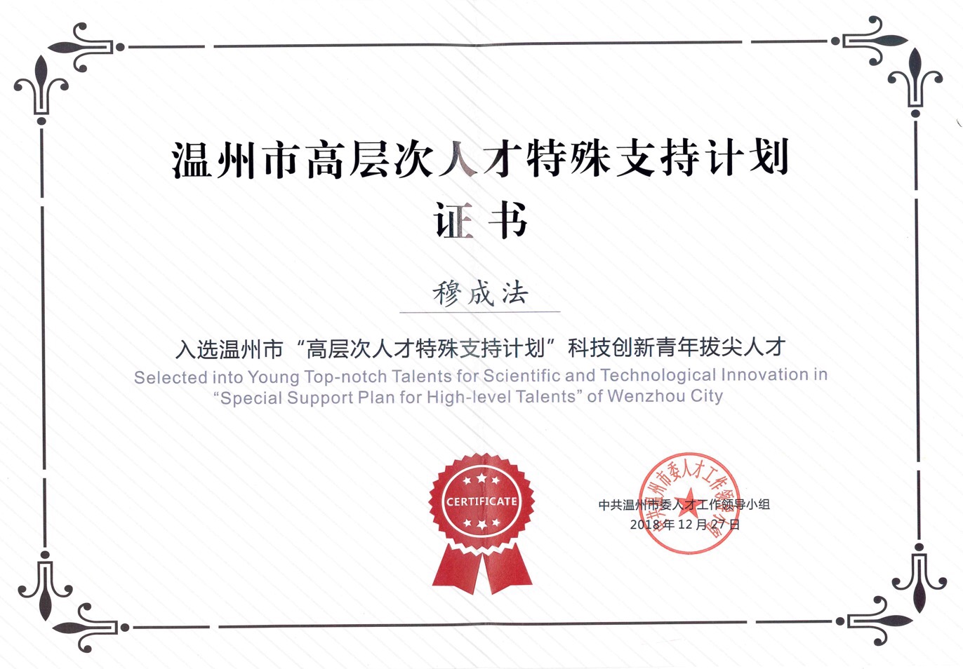 穆成法喜獲溫州市“高層次人才特殊支持計劃”科技創新青年拔尖人才稱號