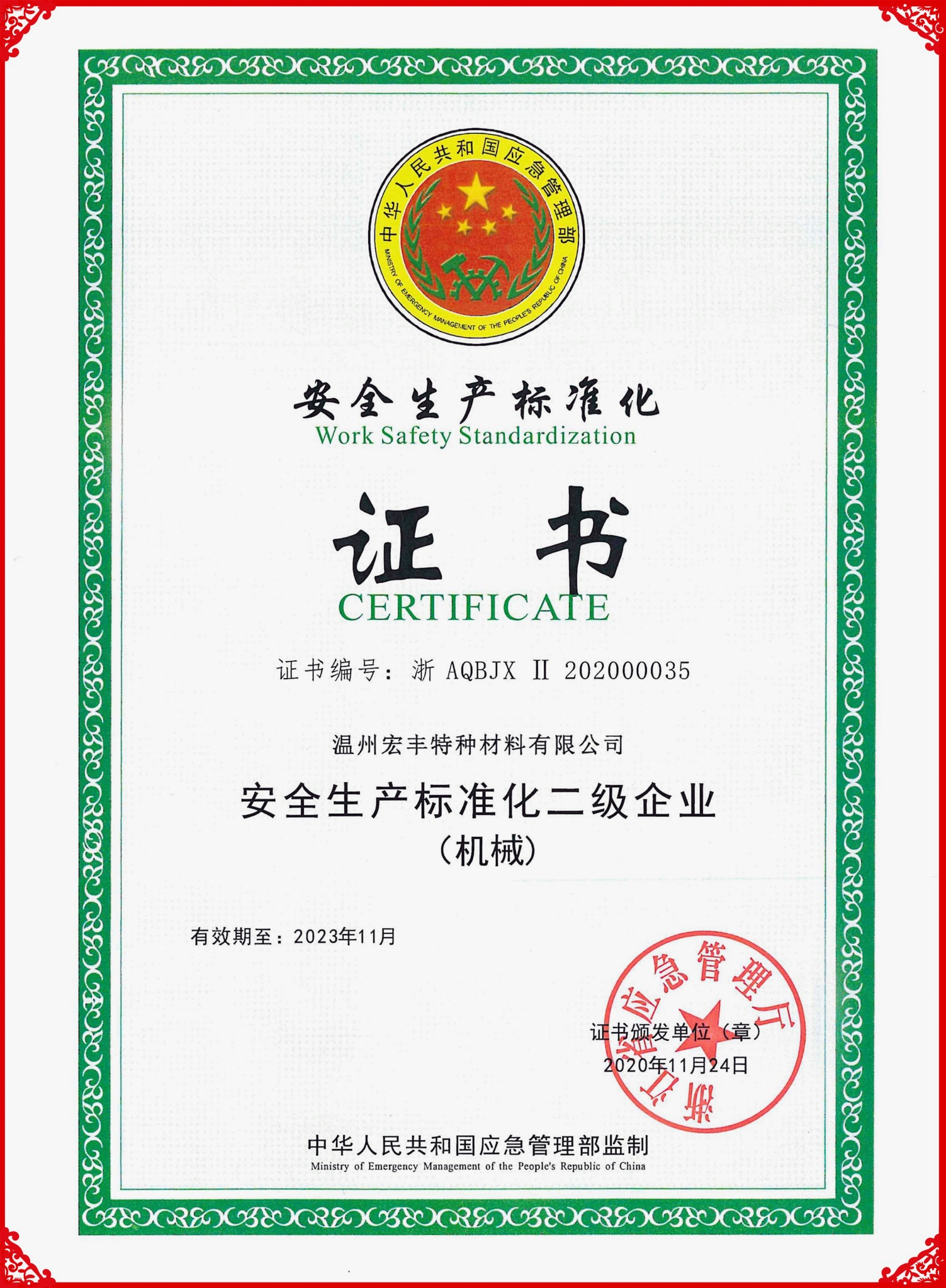 近日,溫州宏豐特種材料有限公司獲得了由中華人民共和國應急管理部監制,浙江省應急管理廳頒發的“安全生產標準化二級企業(機械行業)”證書,有效期三年,標志著溫州宏豐安全生產標準化建設取得階段性成果。這也是甌江口產業集聚區第一家獲得該證書的企業。